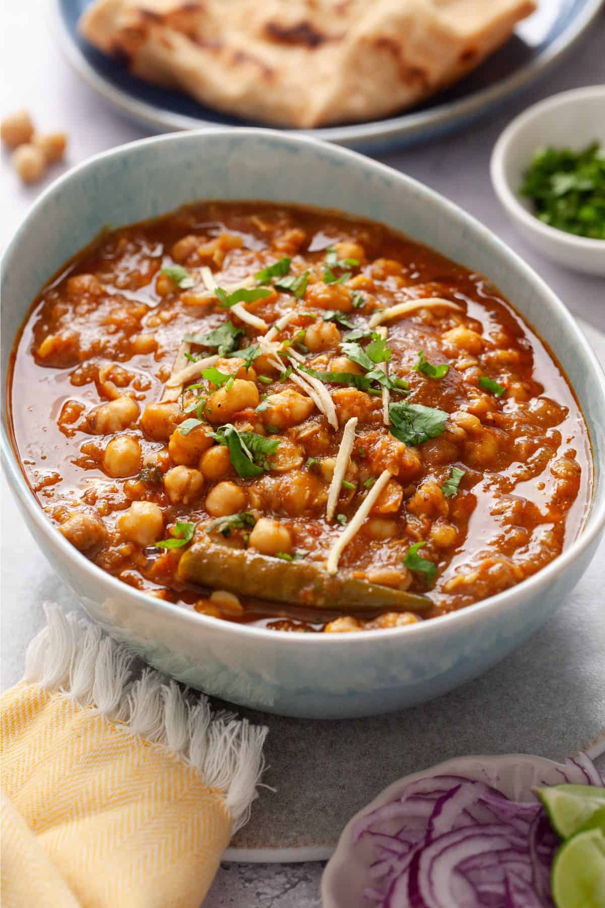 - Garnish with chopped cilantro and extra ginger juliennes if desired.Serve warm with flabreads or cumin rice. Thiny sliced onions are a must with chana in indian meals. A bowl of cooling boondi raita balance the warmth of the curry